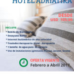 Precios de Oferta en El Hotel Adriatika Precio Incluye: * Bebida de Bienvenida * Desayuno Buffet * Internet Inalámbrico de alta velocidad * Traslados Aeropuerto- Hotel – Aeropuerto * 1 botella de agua pura de cortesía * uso de instalaciones (gimnasio, Piscina, Jacuzzi, Sauna) Precio en habitación sencilla o doble por Noche PRECIO DE OFERTA […]