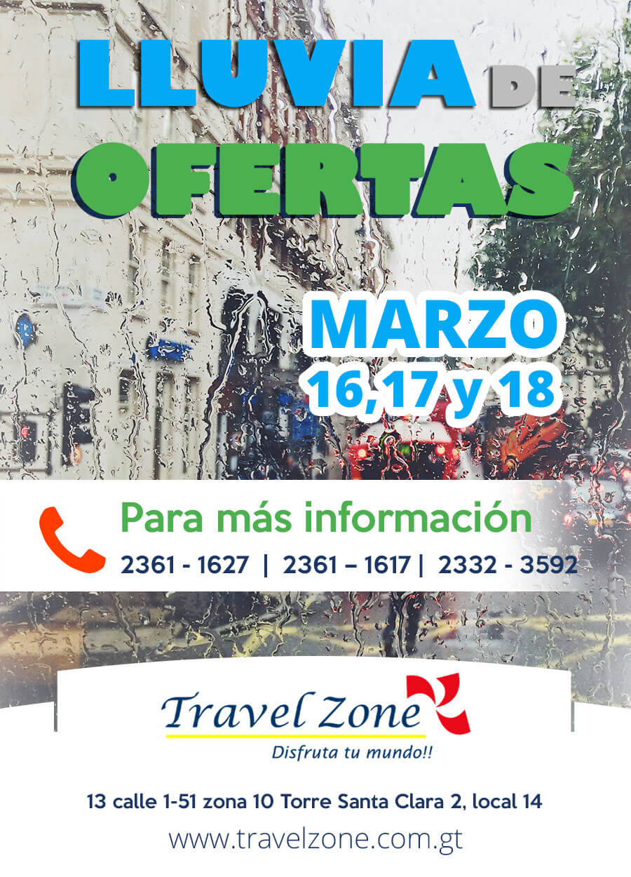 Lluvia de Ofertas Lluvia de Ofertas, espérelas este 16,17 Y 18 De Marzo Para más información comunícate a los teléfonos (502) 2361-1627 | (502) 2361 – 1617 | (502) 2332 – 3592 Travel Zone: Disfruta tu mundo! 13 calle 1-51 zona 10 Torre Santa Clara 2, local 14